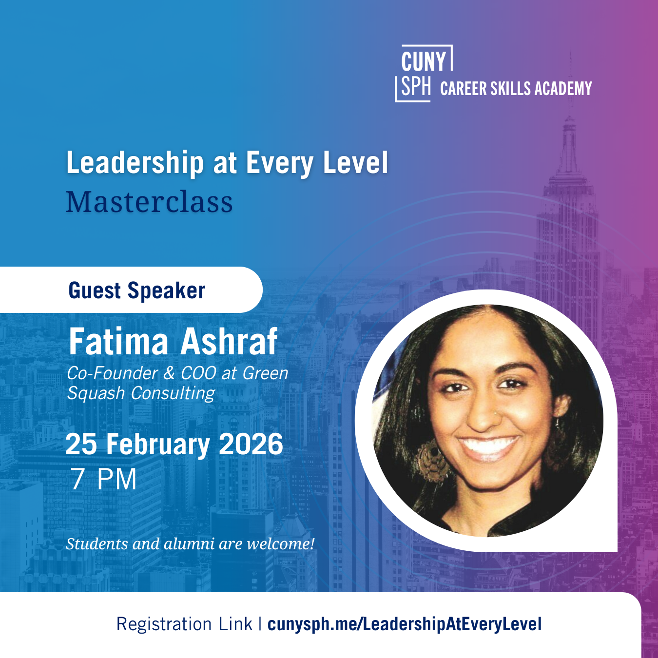 Join the Office of Career Services and the Career Skills Academy for a virtual masterclass with Fatima Ashraf, Co-Founder & COO of Green Squash Consulting.