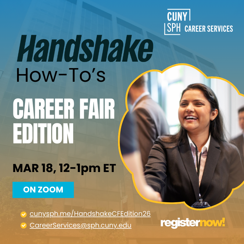 Open to CUNY SPH students and alumni. Email CareerServices@sph.cuny.edu for assistance with registering for this event on Handshake.