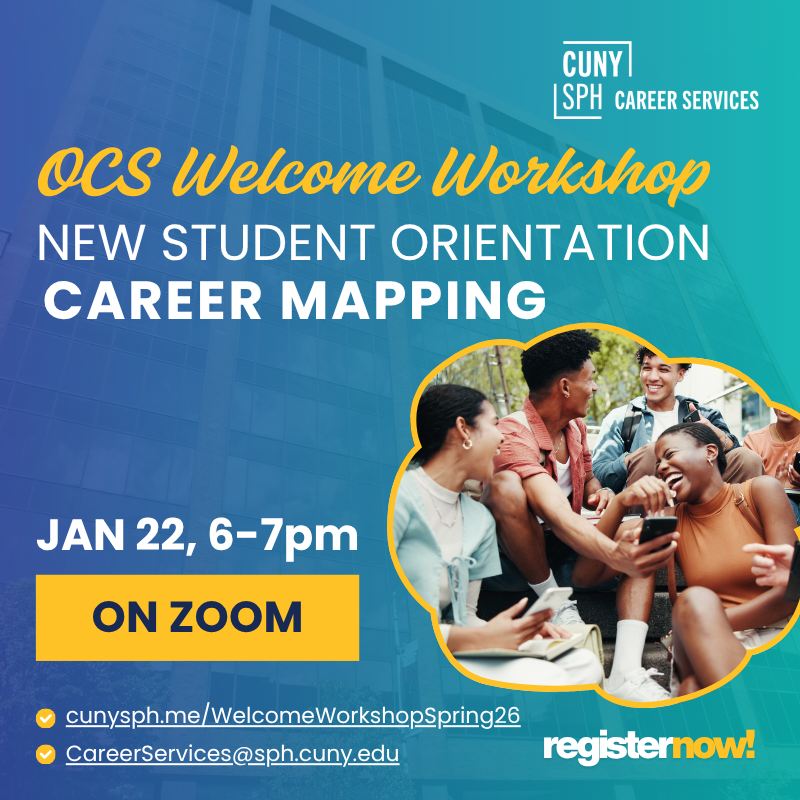 New to CUNY SPH? Join the Office of Career Services (OCS) for this virtual workshop designed to help you start your CUNY SPH journey strong and set yourself up for success from day one.